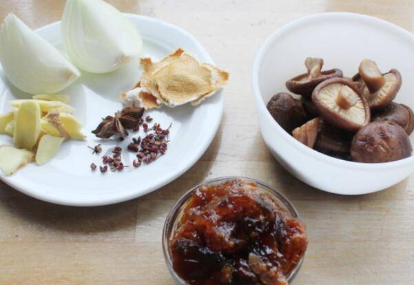 第二天将香菇泡发,准备好生姜、八角、花椒、桔皮、洋葱。