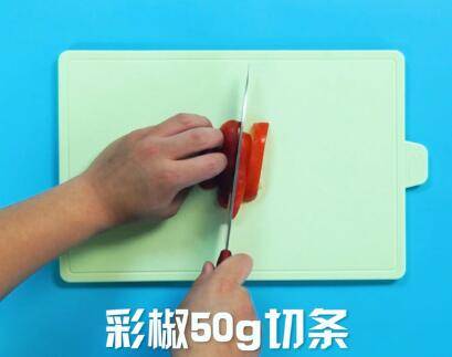 将三色彩椒切成条。