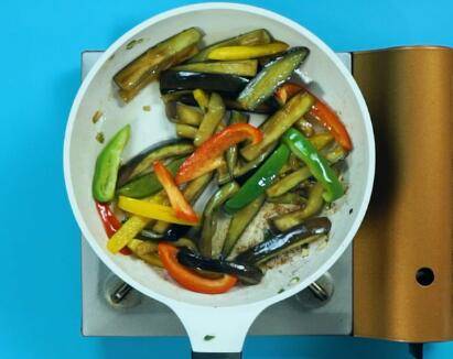最佳答案用料:茄子250克、彩椒50克、葱末5克、蒜末3克、食用油8毫升、生抽3克、盐2克、糖3克。将三色彩椒切成条。茄子切成条。油锅放入葱末、蒜末大火爆香后,倒入茄子大火翻炒2分钟。依次加入生抽、盐、糖翻炒均匀。倒入彩椒。翻炒片刻后,即可出锅。