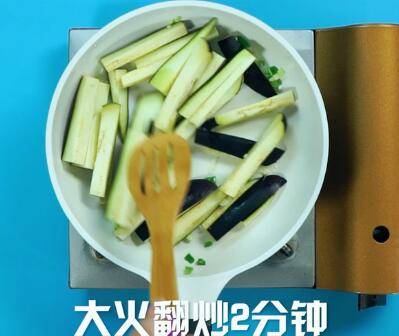 油锅放入葱末、蒜末大火爆香后,倒入茄子大火翻炒2分钟。