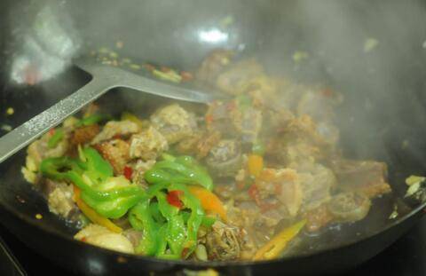 4、锅里放少许油,将鸭肉块炒至表面焦黄后加入姜丝辣椒翻炒片刻,沿着锅边淋少许水,让配料入味。