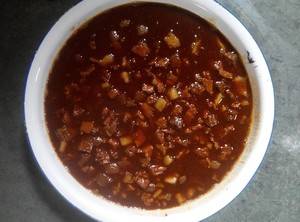 8、加味极鲜,等酱汁煮开后,放入瘦肉、肉渣、和猪皮,小火慢炖,直到香香的炸酱味出来即可。