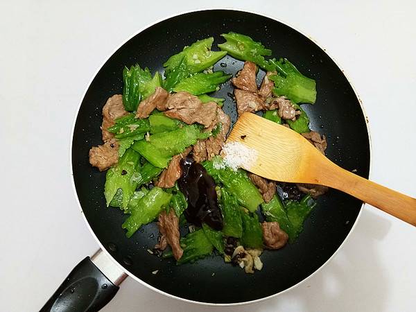 8、爆香调料后放入焯过水的苦瓜和牛肉快速翻炒。