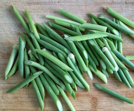 1、蒜苔处理,蒜苔洗好平放在菜板上,刀倾斜与菜板形成30度的夹角,下刀切蒜苔,使蒜苔切面口更大更容易入味。