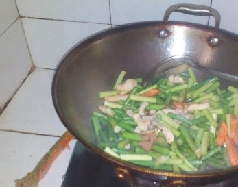 倒入蒜苔和胡萝卜炒匀;