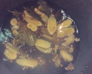 2、姜切片,和香叶,花椒,桂皮小火煮水熬出味;