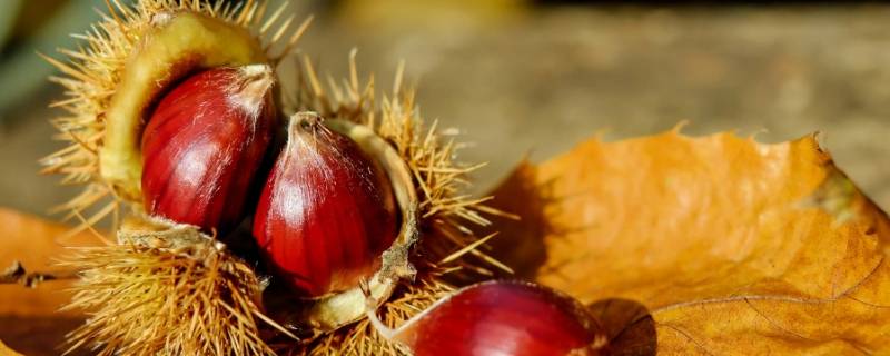 2、板栗:叶披针形或长圆形,叶缘有锯齿。花单性,雌雄同株;雄花为葇荑花序,成熟后总苞裂开,栗果脱落。坚果紫褐色,被黄褐色茸毛,或近光滑,果肉淡黄。