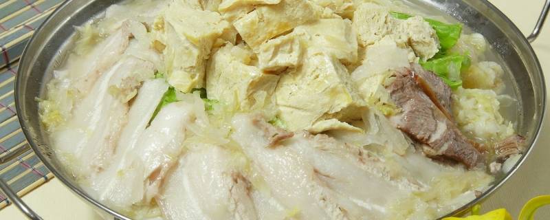 3、酸菜氽白肉:是一道著名的东北菜。做法非常简单,汤汁浓郁,肉中带着酸菜的香味。入口即化,肥而不腻,吃的时候可以附上一碟蒜泥酱油蘸肉片吃。酸菜吸足了肉的浓香,口感脆嫩,非常爽口。