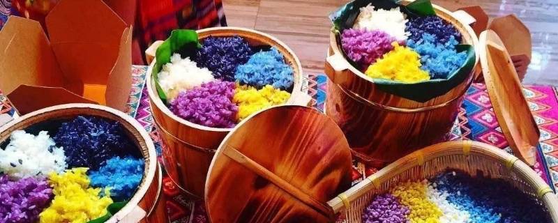 1、五色香糯米饭:五色饭是壮族人民记倚幸福、美好、和谐、吉祥、如意的象征。