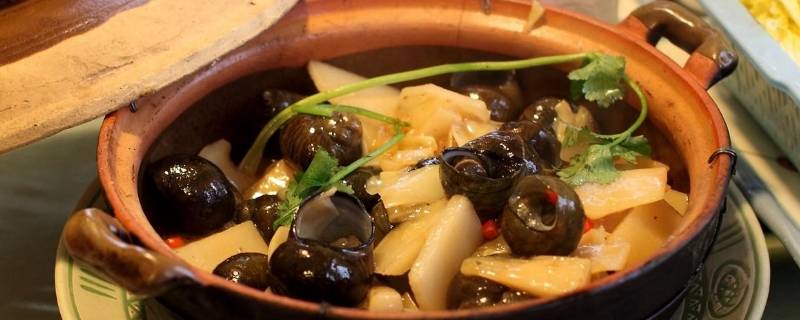 4、酸笋田螺煲: 春夏田螺肥大,配酸笋煲之,去泥气及腥味,再加少许辣椒,酸辣可口,被称之为田间小食。这道菜简单易做,吃起来非常开胃,