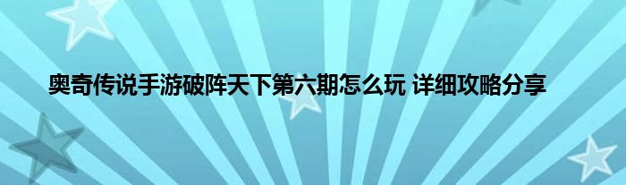 奥奇传说手游破阵天下目前已经开启到了第六期,在第六期当中也给玩家们带来了大量的关卡,这些关卡难度都是不一的,随着关卡的进行难度也会慢慢的上升,但是和上一期的玩法也是相处不了多少,那下面就让小编给玩家们带来破阵天下第六期攻略的分享,希翼能够帮助到各位玩家们。