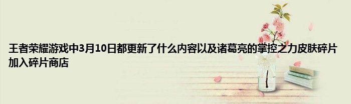 今天弟哥来聊聊一篇关于王者荣耀游戏中3月10日都更新了什么内容以及诸葛亮的掌控之力皮肤碎片加入碎片商店的文章,游戏是很多人的选择,但是游戏玩多了也会身心疲惫,现在就为大家来简单介绍下王者荣耀游戏中3月10日都更新了什么内容以及诸葛亮的掌控之力皮肤碎片加入碎片商店,希望对各位小伙伴们有所帮助。