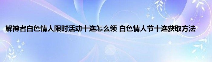 解神者白色情人限时活动十连怎么领?解神者游戏最近开启了白色情人节限时活动,这次的活动里我们是可以获得一个免费十连的,这个十连奖励应该有很多的玩家想要获取吧,具体的获取方法是什么呢?下面就一起来看看吧。
