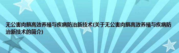 本文关于无公害肉鹅高效养殖与疾病防治新技术的简介就讲解完毕,希望对大家有所帮助。
